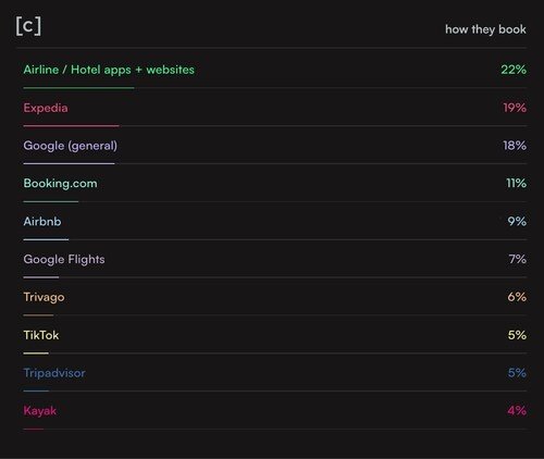 TikTok is seen as a key supply for inspiration and reserving recommendation, coming into the reserving funnel as a discovery layer for offers. One in 4 Gen Zers are skipping the intermediary, bypassing on-line journey companies (OTAs) and third-party platforms and selecting to ebook straight via airline and lodge web sites and apps. Those that use OTAs want Expedia.